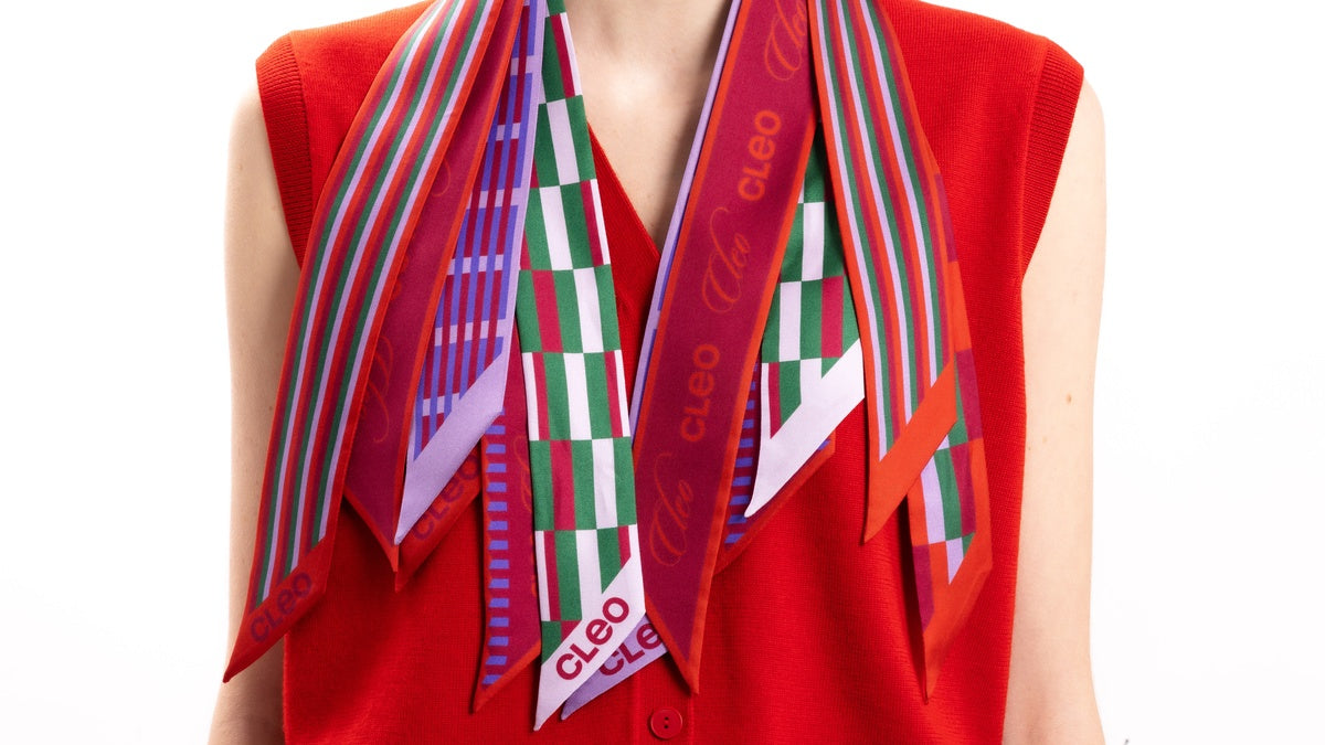 Every Cleo silk scarf is created from 100% Mulberry silk twill (14 momme), digitally printed for rich, lasting colour, and hand folded with rolled edges - craftsmanship that turns a scarf into something more. Minimalist, timeless, contemporary: each piece is a note of elegance you can tie, wear, and play with in your own way.