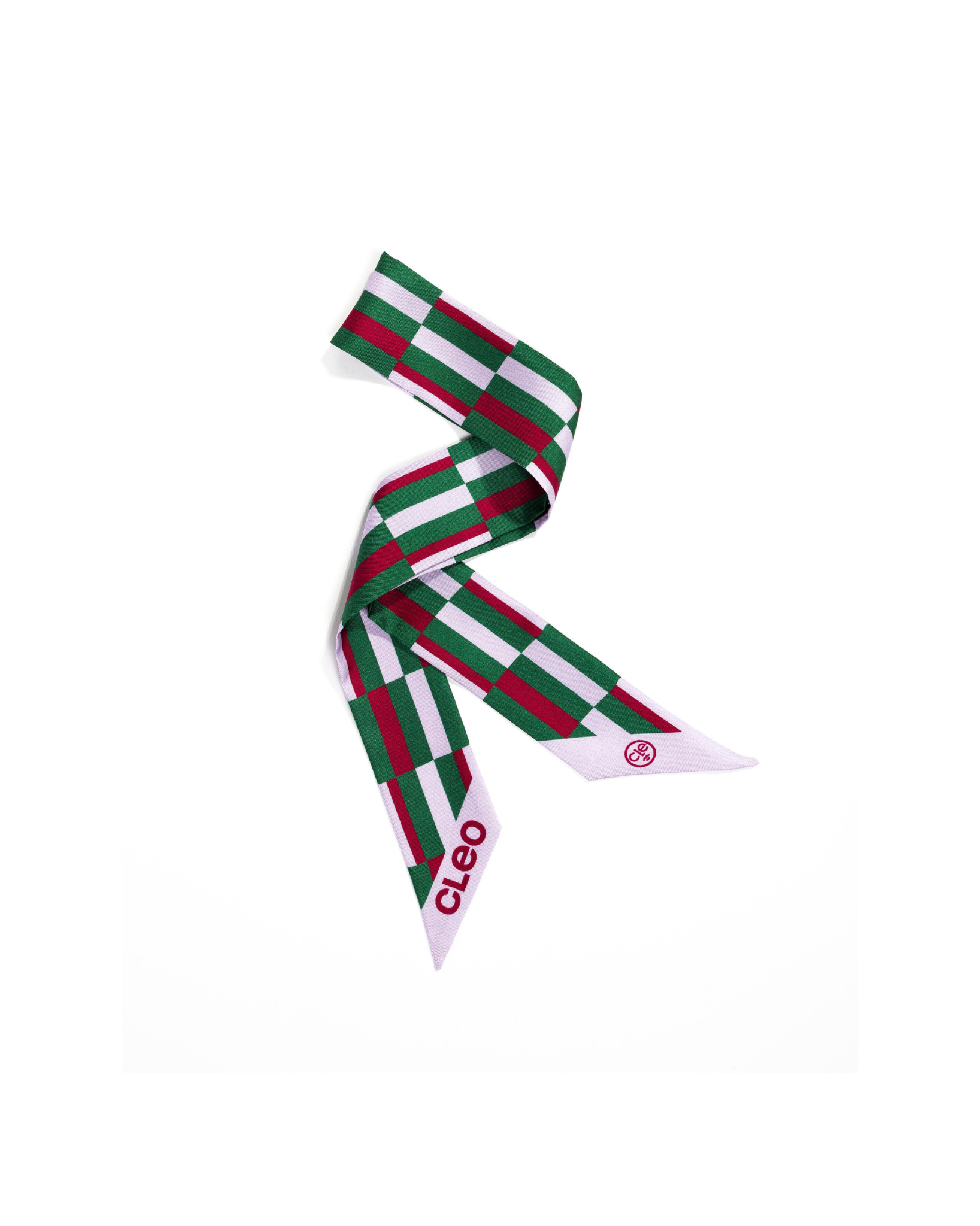 Twilly (5 x 91 cm): For when Cleo is restless. A light, sleek strip of silk to knot through bag handles, tie around a ponytail or at your wrist, or wear as a slender stole. Endlessly wearable, always expressive.